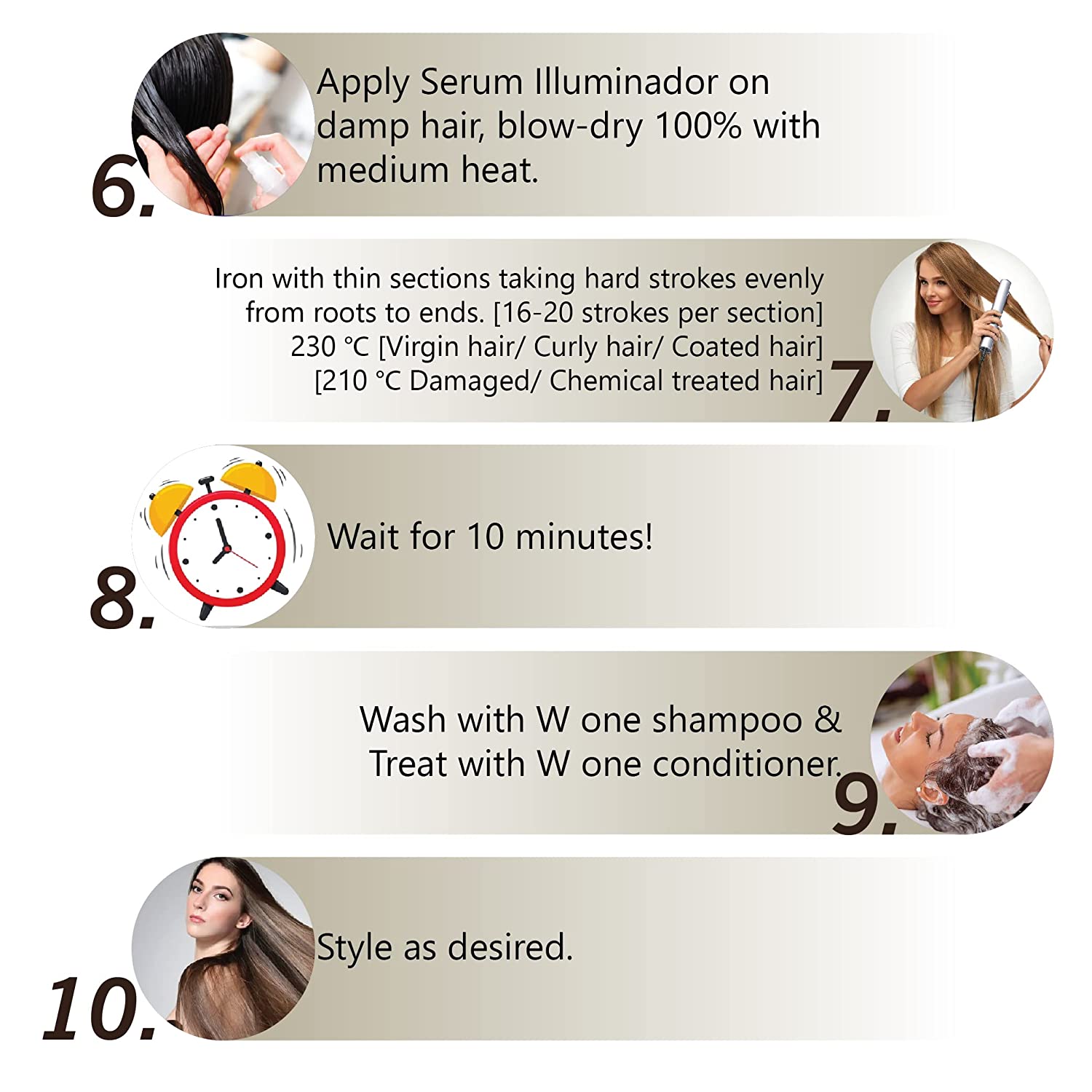 Rinse again, then apply W‑One 3‑in‑1 conditioner for 10 minutes—rinse and style.