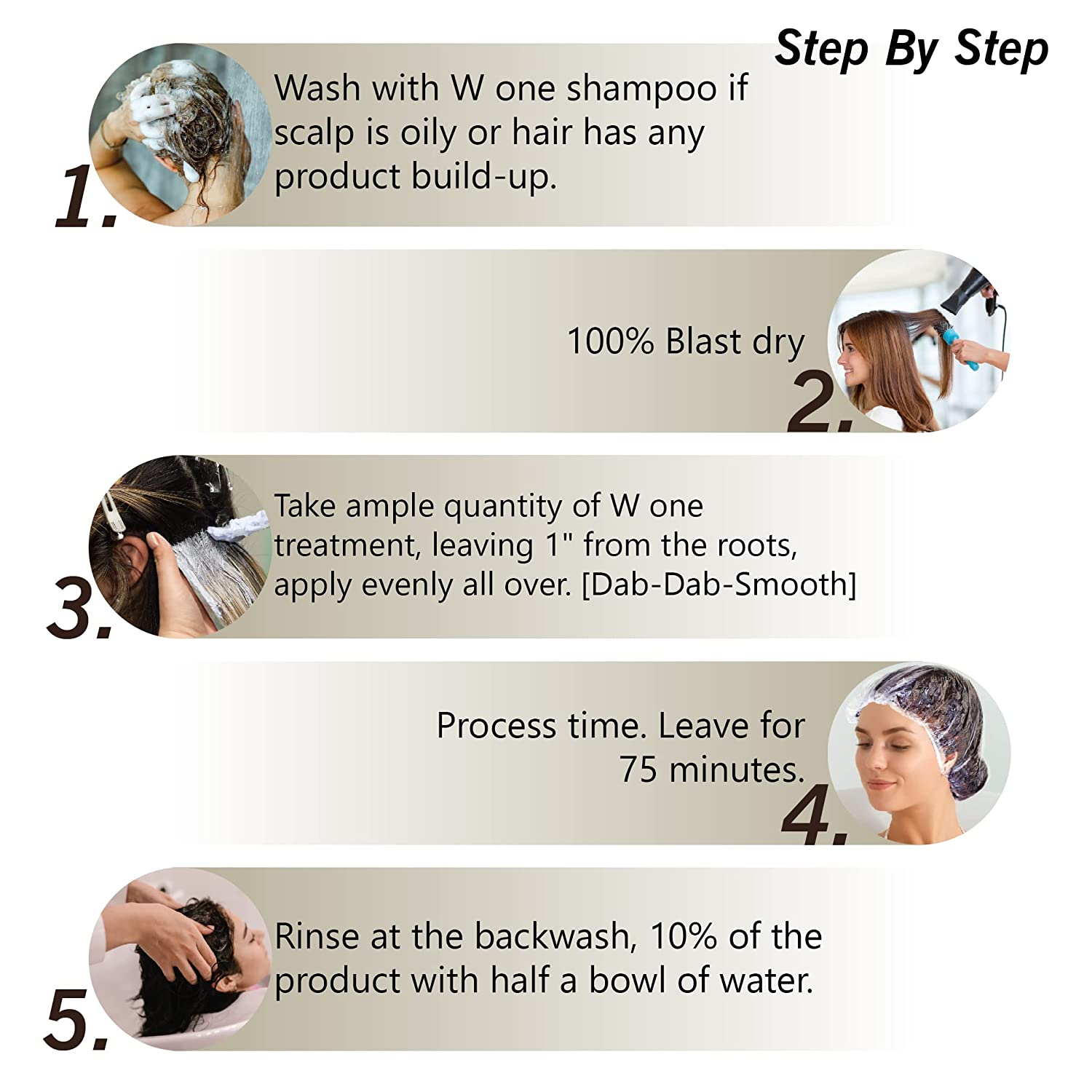 Rinse again, then apply W‑One 3‑in‑1 conditioner for 10 minutes—rinse and style.